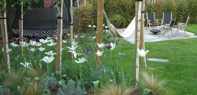 Natural drifts of planting were created to complement the hard landscaping and the birch trees. Bamboo screens the fence and an additional patio added to catch the afternoon sun along with two poles to hang a hammock amongst the birch trees. The front garden took a modern theme of lines of slate running through grey cedec to a feature boulder, surrounded by woodland style planting. The overgrown shrubs on the boundary were removed and a smart row of pleached trees took their place, giving privacy whilst allowing a beautiful flint wall to be seen.