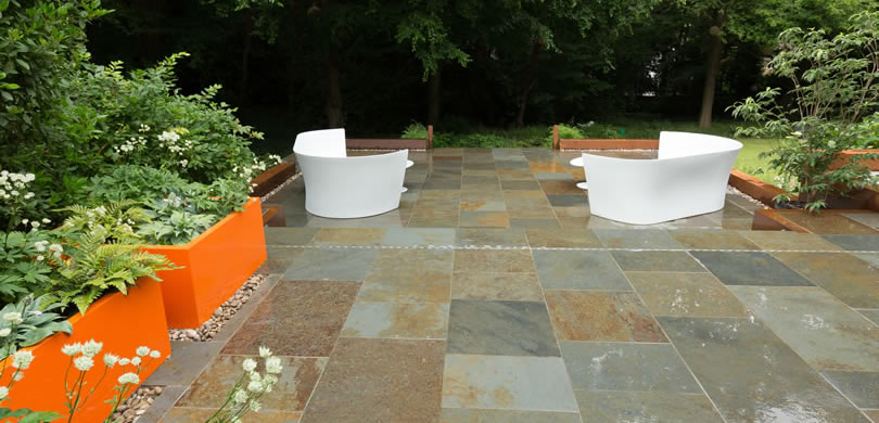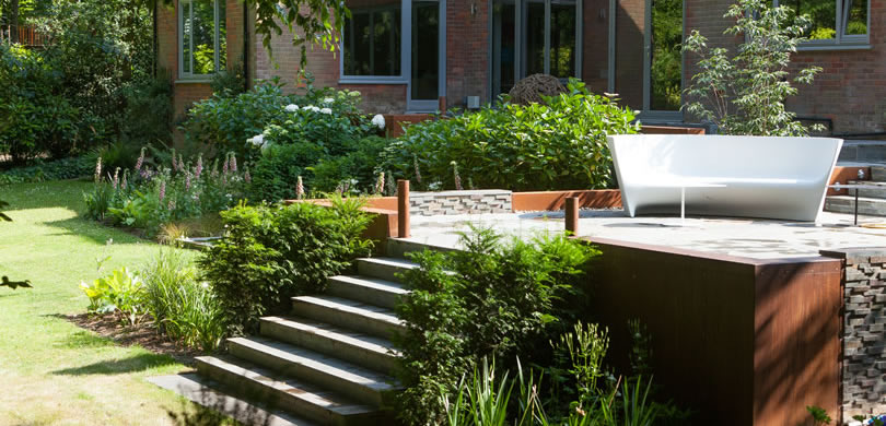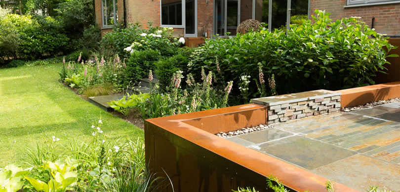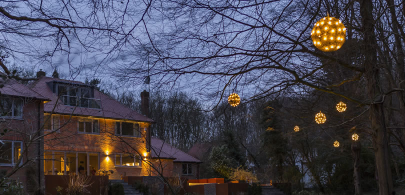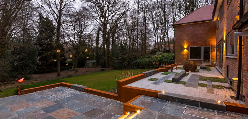 A block and beam construction extended the terrace on a lower level while the existing terrace was raised in one section creating three levels for the different spaces. The existing walls were modified and all walls, new and old, were clad in Corten steel with ‘3D’ slate panels inserted to match the new slate paving. Rachel Carter Sculpture worked with us to create the willow ball and the hanging lights in the woodland, and we designed the Corten tube lights using a hole pattern based on star constellations. The green squares were artificial lawn as the existing concrete terrace did not allow planting.