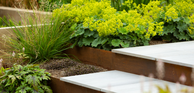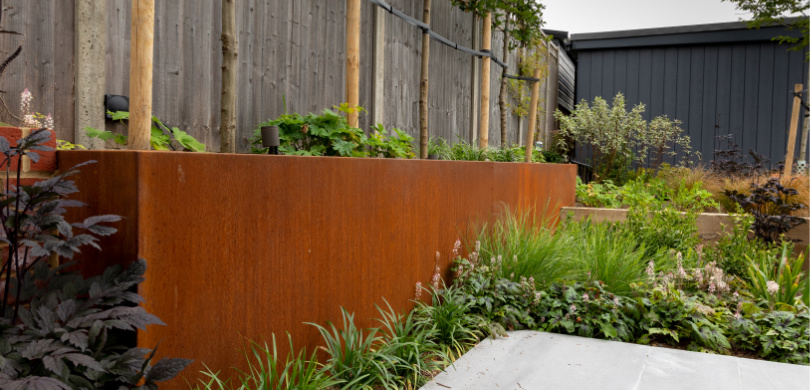 Wide inviting steps take you into the space and a contrasting porcelain subtly marks out a path to draw you further into the garden. The water feature makes a stunning focal point from inside the gym and a dining area and relaxing area complete the functional spaces. A pergola prevents the relaxing area from feeling too exposed while not blocking any views. The contemporary design uses touches of Corten steel throughout but is softened with planting and a meadow area at the back to help the garden blend seamlessly into the surroundings, creating the illusion of a much bigger space.