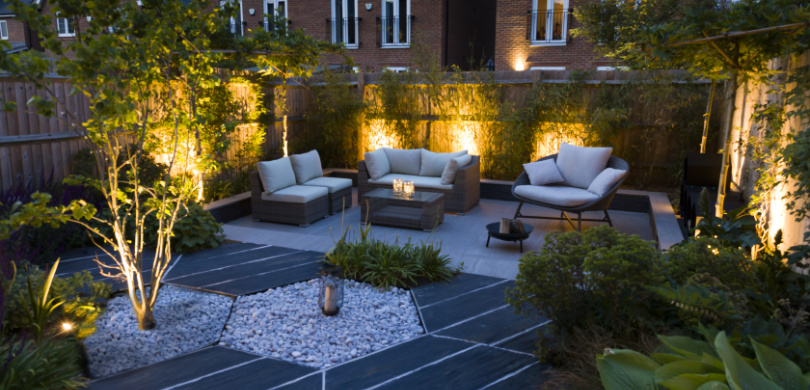 The innovative design was inspired by a hexagonal motif which was used both in the paving and a bespoke powder coated steel wood store. A sunken patio was created, paved in porcelain with roof trained trees planted either side and bamboo to the rear to create some privacy from neighbours. An unusual slate wood from CED Ltd was used for the hexagon centre section. The client wanted structural planting with some colour, and climbers will in time cover all the fencing creating a really green space. Subtle lighting completes the look.