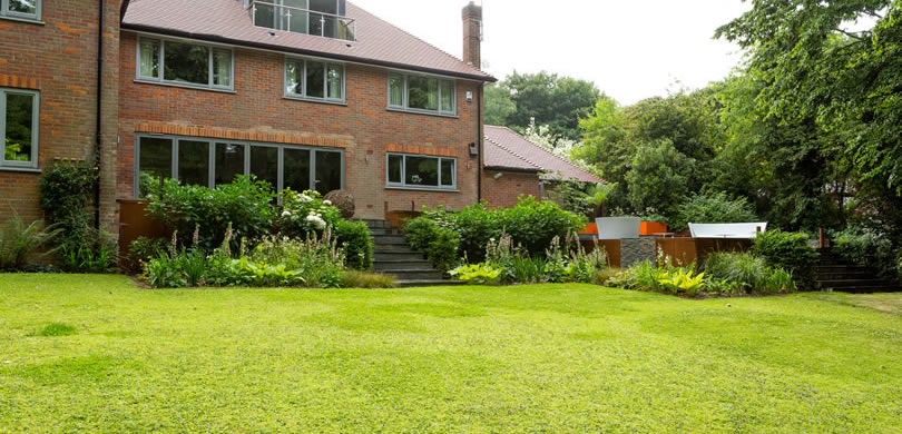 The clients had a dull concrete terrace almost completely in the shade of their north-facing house, they wanted to extend it to create seating in the sun and also update the whole area to give a modern garden suited to their tastes and lifestyle. Lighting was a key element for the clients.