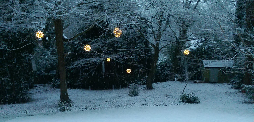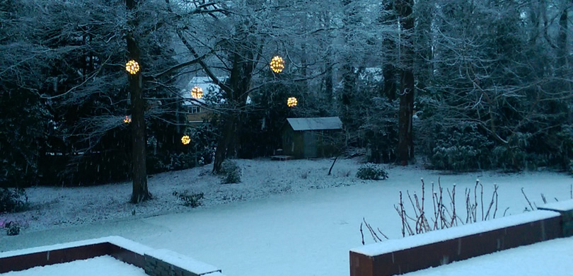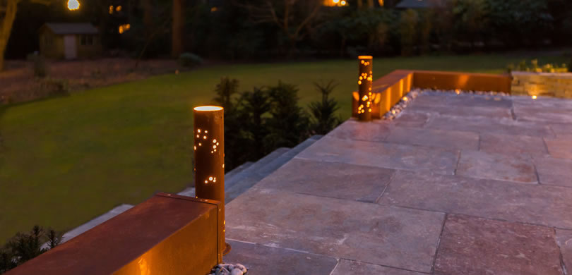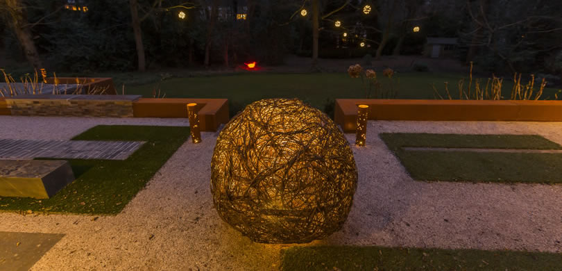 A block and beam construction extended the terrace on a lower level while the existing terrace was raised in one section creating three levels for the different spaces. The existing walls were modified and all walls, new and old, were clad in Corten steel with ‘3D’ slate panels inserted to match the new slate paving. Rachel Carter Sculpture worked with us to create the willow ball and the hanging lights in the woodland, and we designed the Corten tube lights using a hole pattern based on star constellations. The green squares were artificial lawn as the existing concrete terrace did not allow planting.