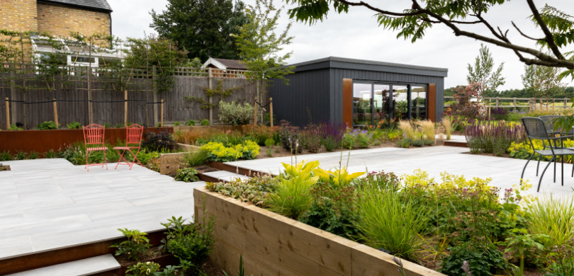 The house was being extended and the garden had fabulous views of the countryside; a new outbuilding (gym) was required and the levels needed a re-think to make the garden more inviting.