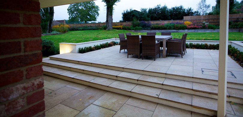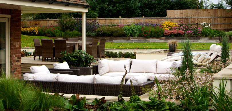 This sloping garden belonged to a new-build property set in the countryside. The clients wanted a very contemporary entertainment space that worked with the double aspect of the main living area of the house.