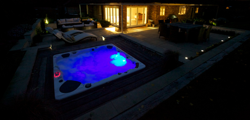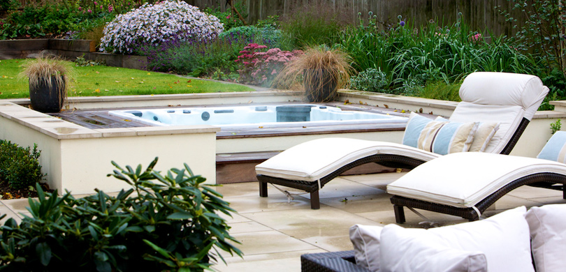 A clean rectilinear geometry was used to organise the design around the living area. The sloping garden allowed the use of retaining walls and long elegant steps to divide up the areas. A raised area for dining and a lower area for relaxing were created. A built in seat was included in the sofa area to allow for extra seats but doubled as structural feature all year round. The hot tub was semi recessed into the raised area allowing people to sit in the hot tub and still talk to others in the sofa area. The planting was based on soft perennials and grasses to help blend into the countryside setting.
