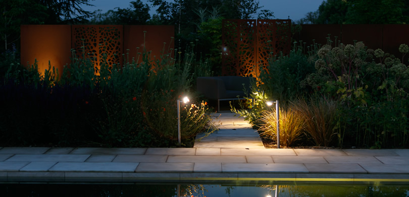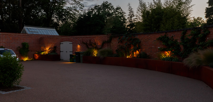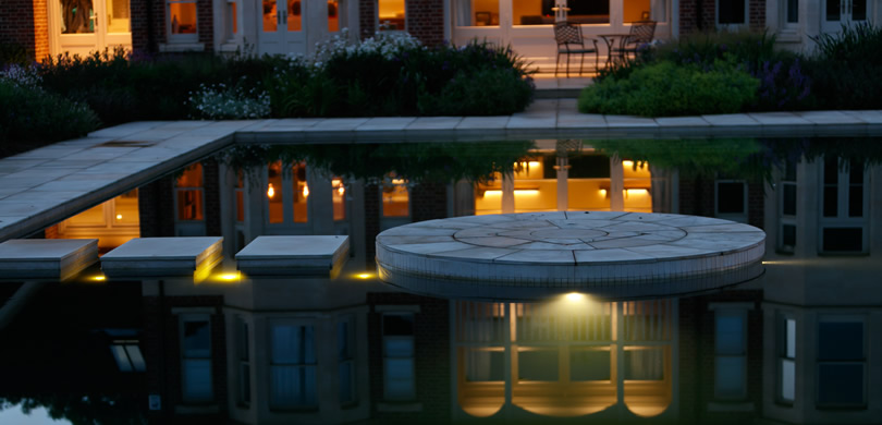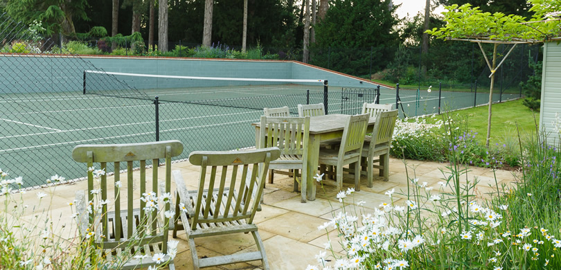 A rill with a series of waterfalls connects the main pool to the filtration beds which in themselves form a feature. A dining area with a larger rill and water feature connecting to the pool via a chute on the other side completes the water elements. A tennis court, strolling garden with rose arbour, hot garden complete with hot tub and changing rooms and a walled garden with a greenhouse are the other main parts of this garden. A new driveway and entrance complete the landscape.
