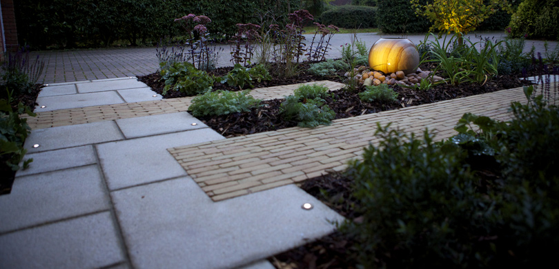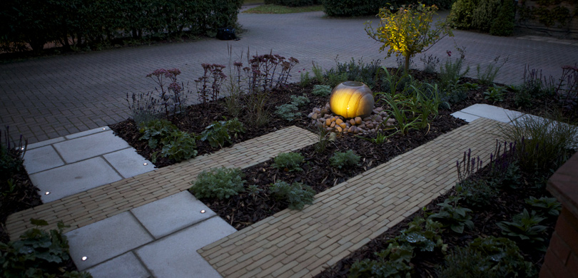 Belgian block pavers were used to add interest to a new path giving access to the back gate and the front door and then the pavers were replicated in a small path leading to a Foras stone water feature. Lighting inset in the path and lighting on the water feature were added, along with low maintenance planting to give all year round interest. We subsequently designed the client’s back garden too.