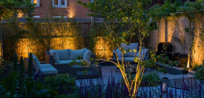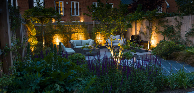 The innovative design was inspired by a hexagonal motif which was used both in the paving and a bespoke powder coated steel wood store. A sunken patio was created, paved in porcelain with roof trained trees planted either side and bamboo to the rear to create some privacy from neighbours. An unusual slate wood from CED Ltd was used for the hexagon centre section. The client wanted structural planting with some colour, and climbers will in time cover all the fencing creating a really green space. Subtle lighting completes the look.